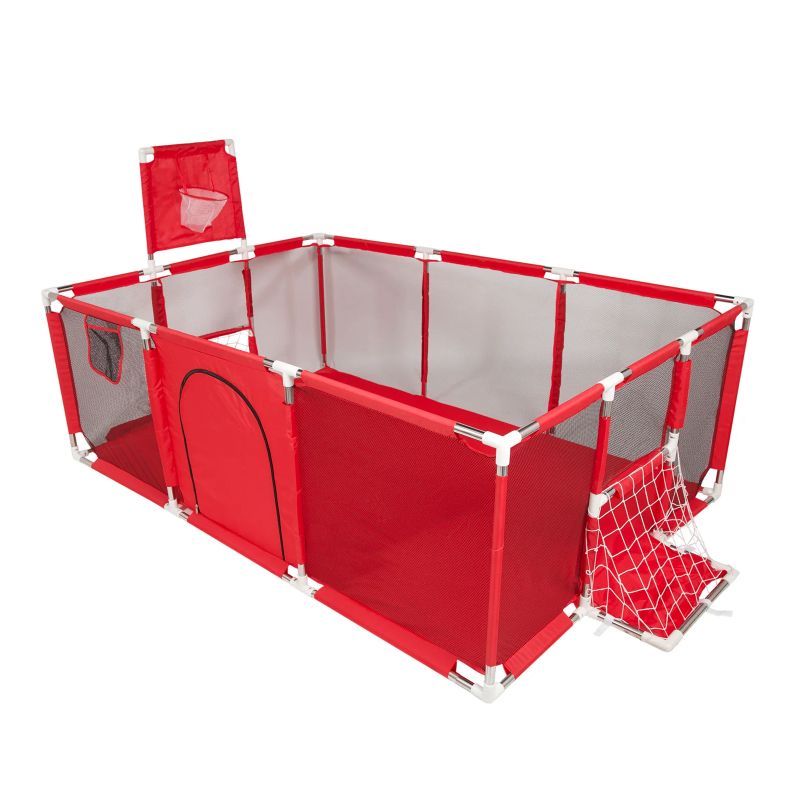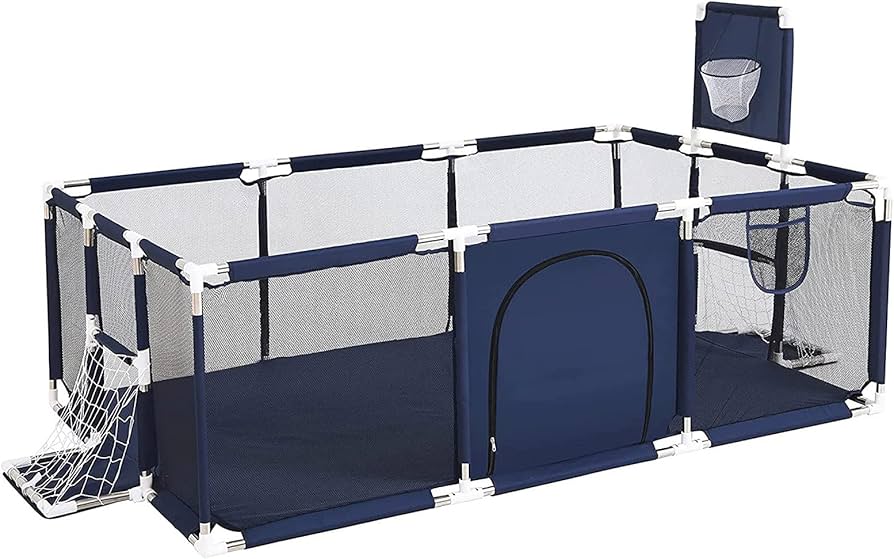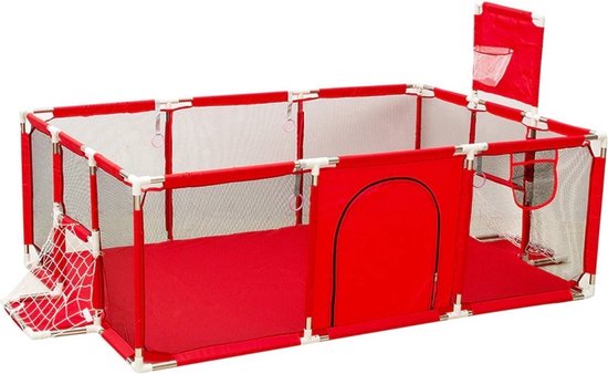 Parque infantil: un corralito para bebés con un aro de baloncesto y una puerta de fútbol, añadiendo artículos de juego para el bebé, puede estimular la curiosidad del bebé, cultivar la concentración y la independencia del niño; hay una pequeña bolsa de almacenamiento en el costado del corral, que se puede utilizar para almacenar juguetes, aperitivos, etc.